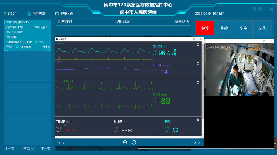 生命体征实时监测共享:通过信息采集技术实时采集救护车内相关医疗设备监测的患者生命体征参数,并传输至医院端,为院内专家远程协助指导院前救治以及提前准备院内抢救方案、资源等提供依据。